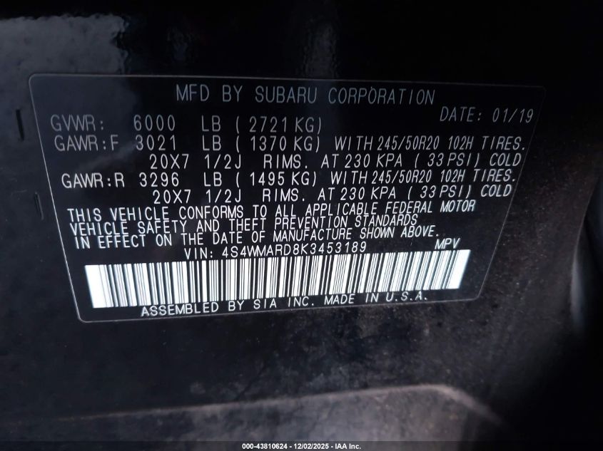 2019 SUBARU ASCENT 2019 року Бензин, 2.4, Полный привод, vin - 4S4WMARD8K3453189 из США