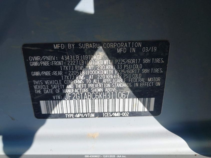 2019 SUBARU CROSSTREK 2019 року Бензин, 2.0, Полный привод, vin - JF2GTABC6KH311067 из США