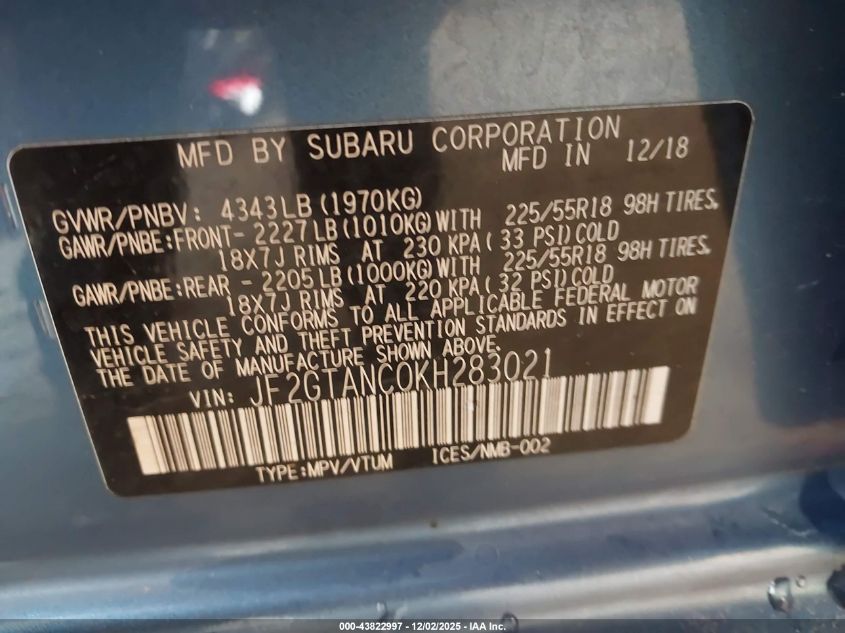 2019 SUBARU CROSSTREK 2019 року Бензин, 2.0, Полный привод, vin - JF2GTANC0KH283021 из США