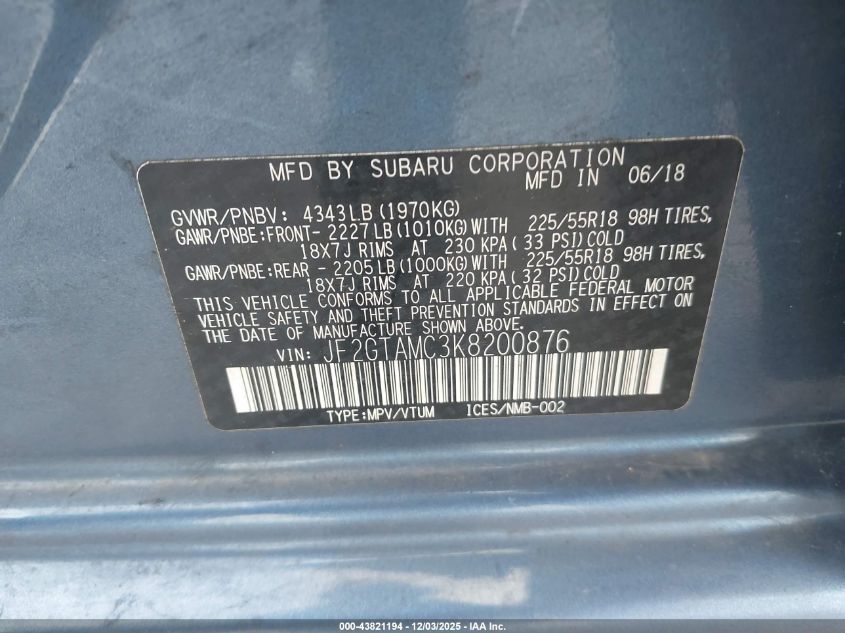 2019 SUBARU CROSSTREK 2019 року Бензин, 2.0, Полный привод, vin - JF2GTAMC3K8200876 из США