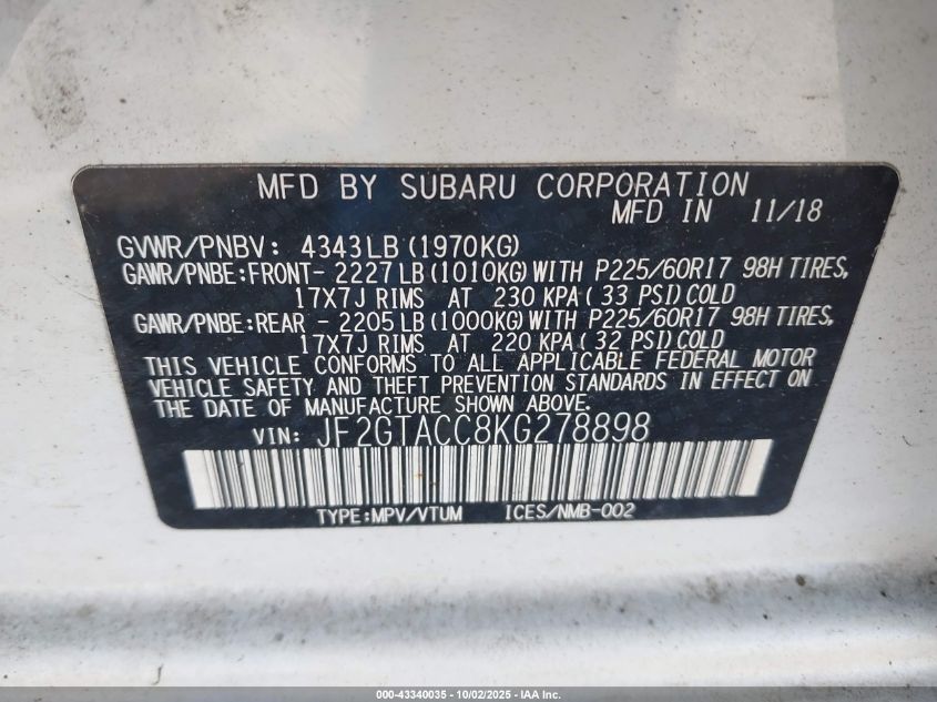 2019 SUBARU CROSSTREK 2019 року Бензин, 2.0, Полный привод, vin - JF2GTACC8KG278898 из США