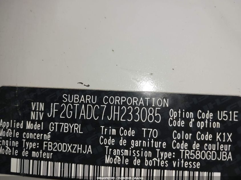 2018 SUBARU CROSSTREK 2018 року Бензин, 2.0, Полный привод, vin - JF2GTADC7JH233085 из США