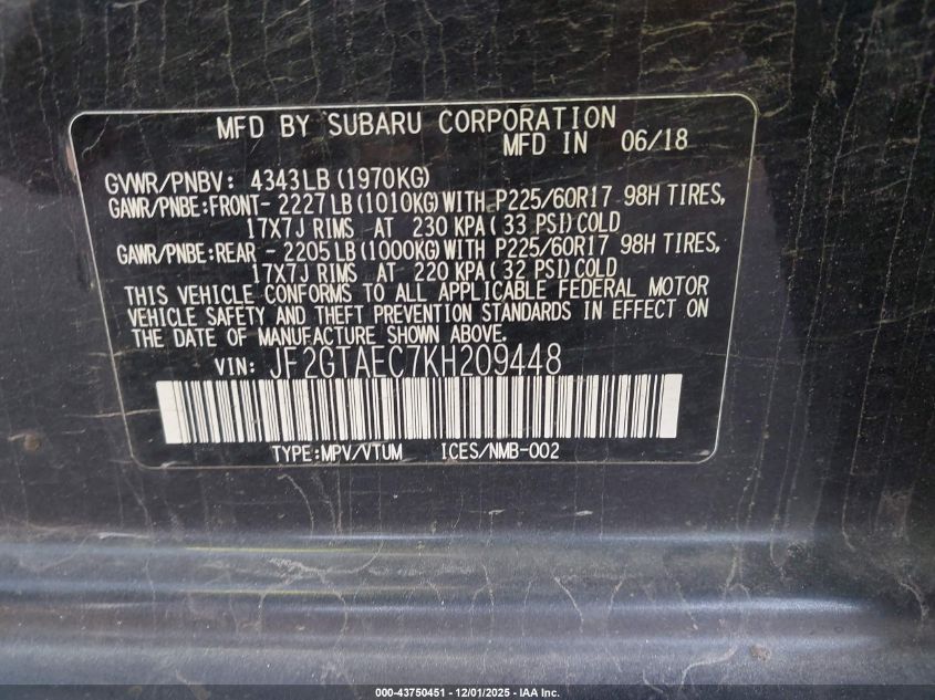 2019 SUBARU CROSSTREK 2019 року Бензин, 2.0, Полный привод, vin - JF2GTAEC7KH209448 из США