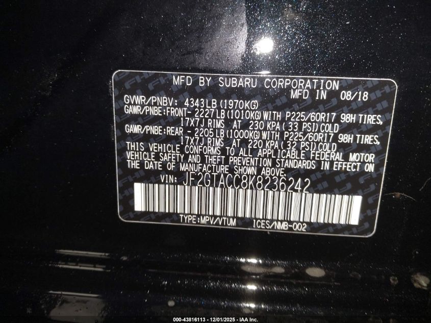2019 SUBARU CROSSTREK 2019 року Бензин, 2.0, Полный привод, vin - JF2GTACC8K8236242 из США