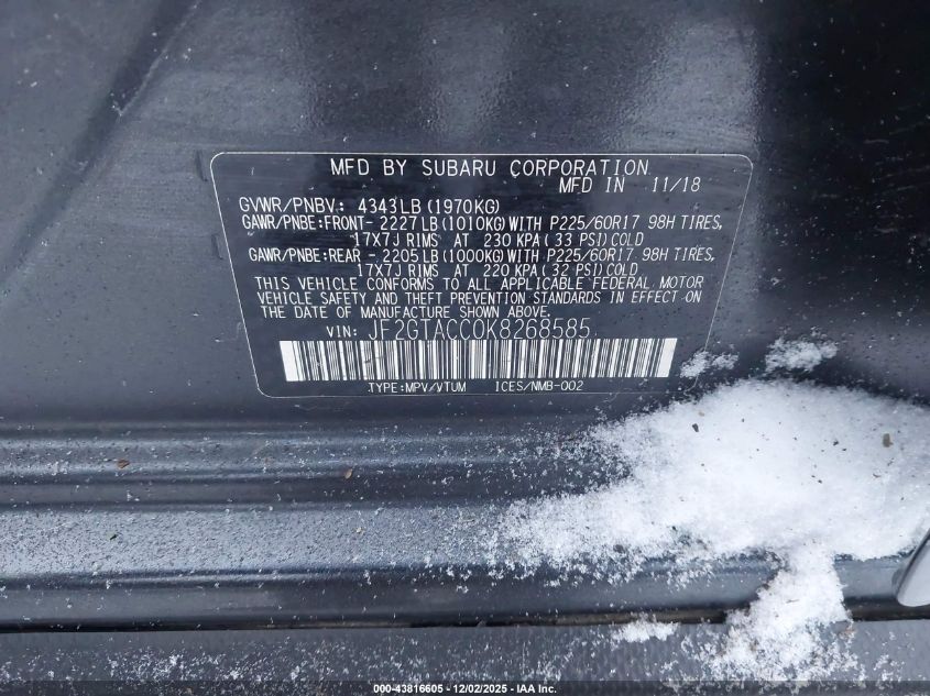 2019 SUBARU CROSSTREK 2019 року Бензин, 2.0, Полный привод, vin - JF2GTACC0K8268585 из США