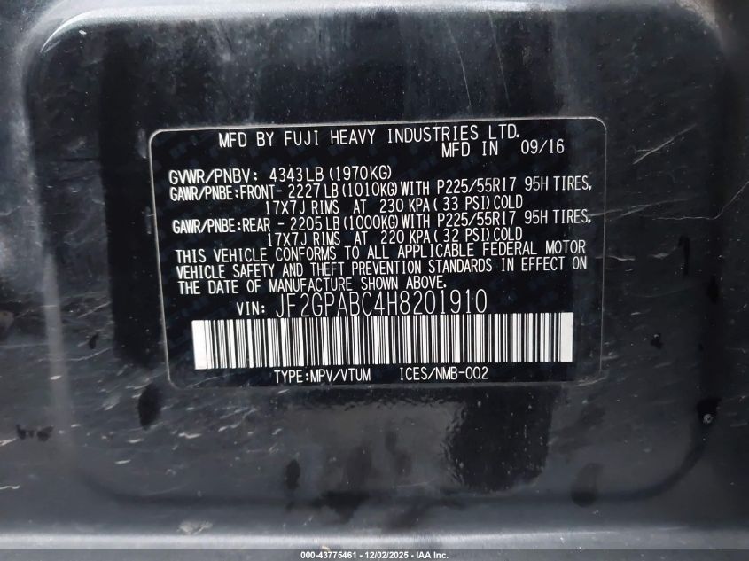 Цвет СерыйЦилиндры 4Привод Полный приводVIN JF2GPABC4H8201910Состояние Заводится и едет (проверено)Повреждения Задняя AutoRIA