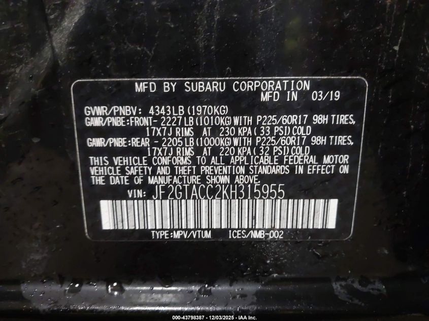 2019 SUBARU CROSSTREK 2019 року Бензин, 2.0, Полный привод, vin - JF2GTACC2KH315955 из США