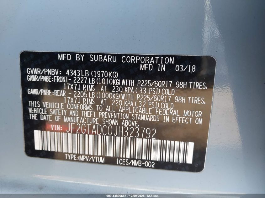 2018 SUBARU CROSSTREK 2018 року Бензин, 2.0, Полный привод, vin - JF2GTADC0JH323792 из США