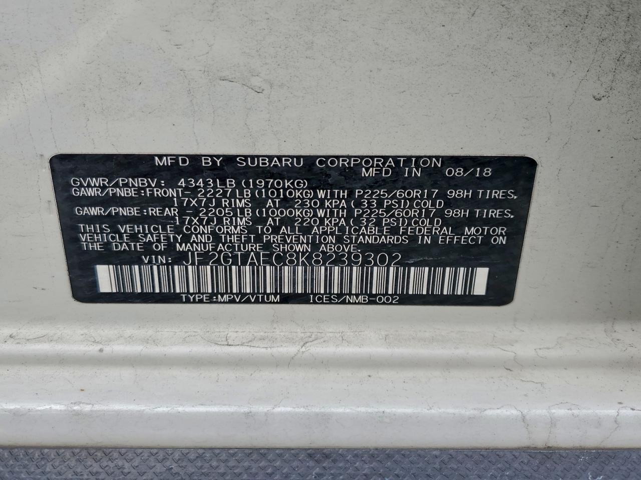 2019 SUBARU CROSSTREK 2019 року Бензин, 2.0, Полный привод, vin - JF2GTAEC8K8239302 из США