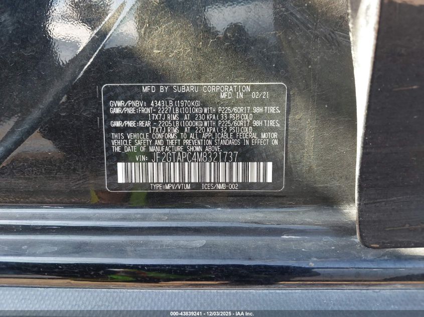 2021 SUBARU CROSSTREK 2021 року Бензин, 2.0, Полный привод, vin - JF2GTAPC4M8321737 из США