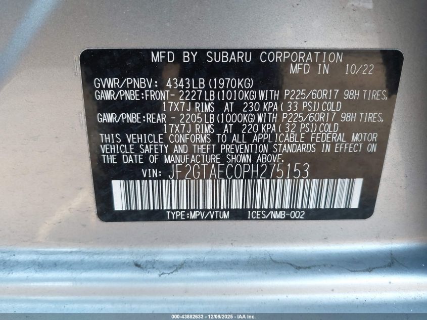 2023 SUBARU CROSSTREK 2023 року Бензин, 2.0, Полный привод, vin - JF2GTAEC0PH275153 из США