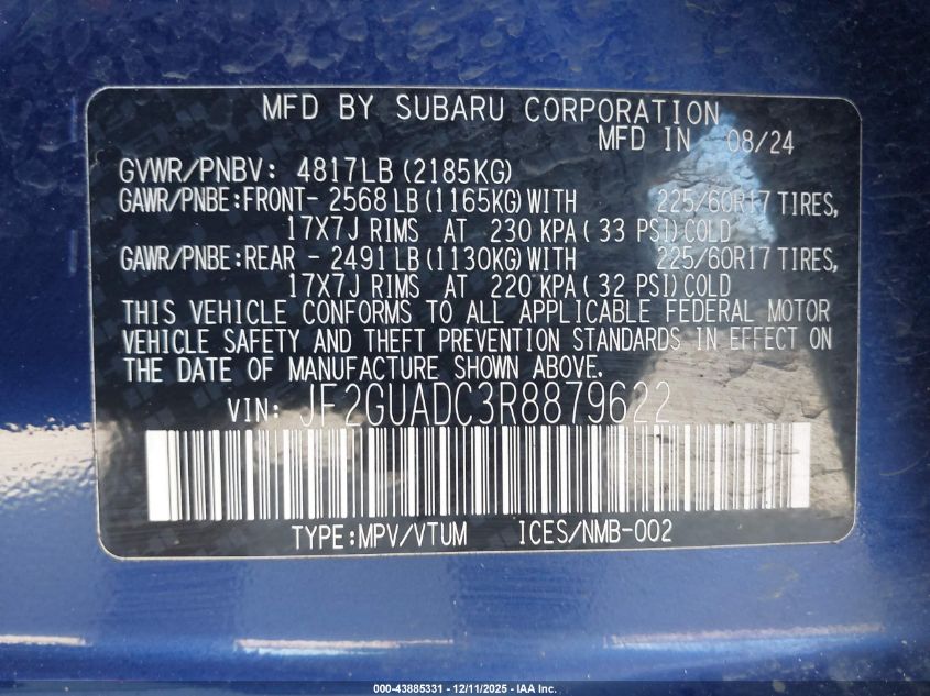 2024 SUBARU CROSSTREK 2024 року Бензин, 2.0, Полный привод, vin - JF2GUADC3R8879622 из США