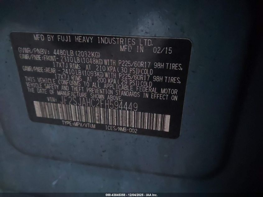 2015 SUBARU FORESTER 2015 року Бензин, 2.5, Полный привод, vin - JF2SJAHC2FH594449 из США