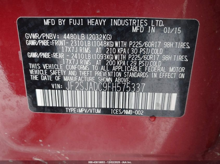 2015 SUBARU FORESTER 2015 року Бензин, 2.5, Полный привод, vin - JF2SJADC9FH575337 из США