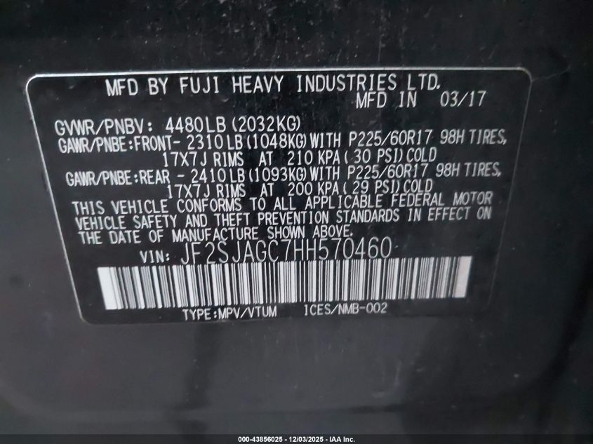 2017 SUBARU FORESTER 2017 року Бензин, 2.5, Полный привод, vin - JF2SJAGC7HH570460 из США