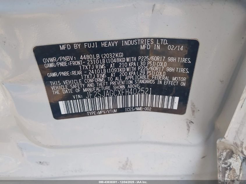 2015 SUBARU FORESTER 2015 року Бензин, 2.5, Полный привод, vin - JF2SJAGCXFH402521 из США