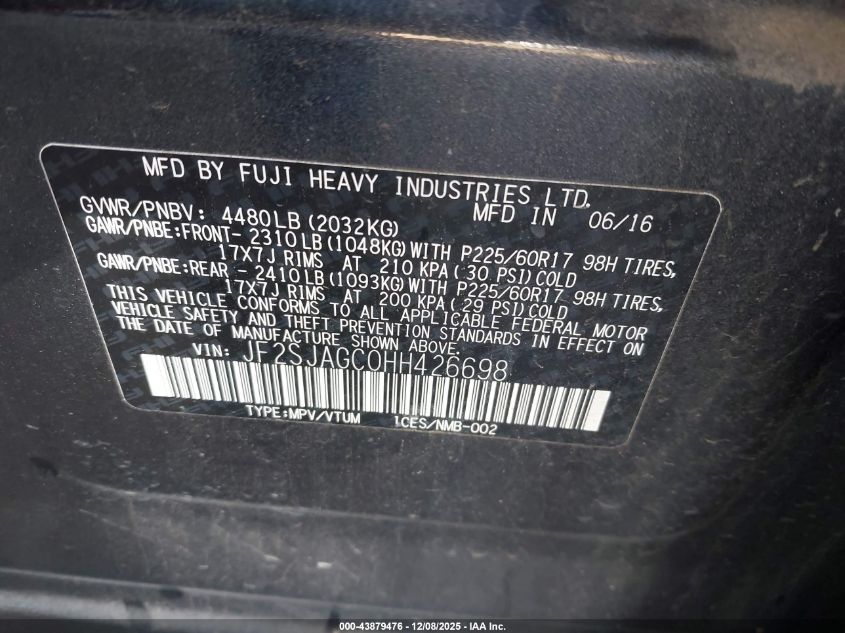 2017 SUBARU FORESTER 2017 року Бензин, 2.5, Полный привод, vin - JF2SJAGC0HH426698 из США