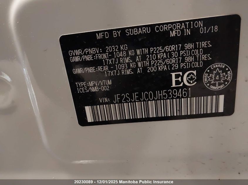 Цвет БелыйЦилиндры 4Привод Полный приводVIN JF2SJEJC0JH539461Состояние СтационарноПовреждения Правая сторонаДата аукциона 2025-12-10 AutoRIA