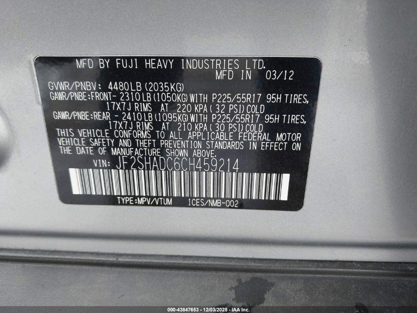 Цвет СерыйЦилиндры 4Привод Полный приводVIN JF2SHADC6CH459214Состояние Заводится и едет (проверено)Повреждения Передняя или задняяДата аукциона 2025-12-08 AutoRIA