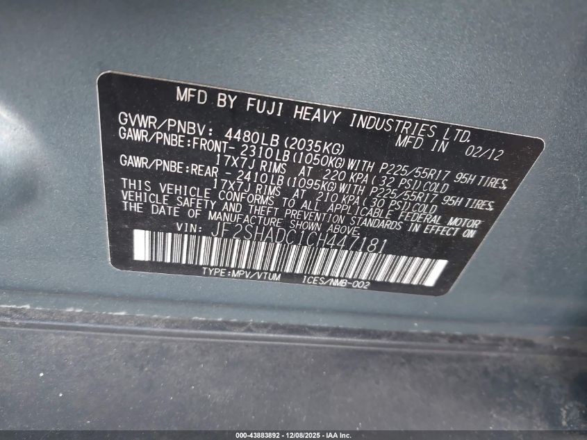 2012 SUBARU FORESTER 2012 року Бензин, 2.5, Полный привод, vin - JF2SHADC1CH447181 из США