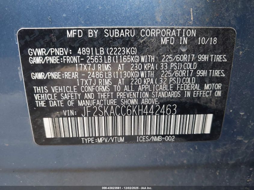 2019 SUBARU FORESTER 2019 року Бензин, 2.5, Полный привод, vin - JF2SKACC6KH442463 из США