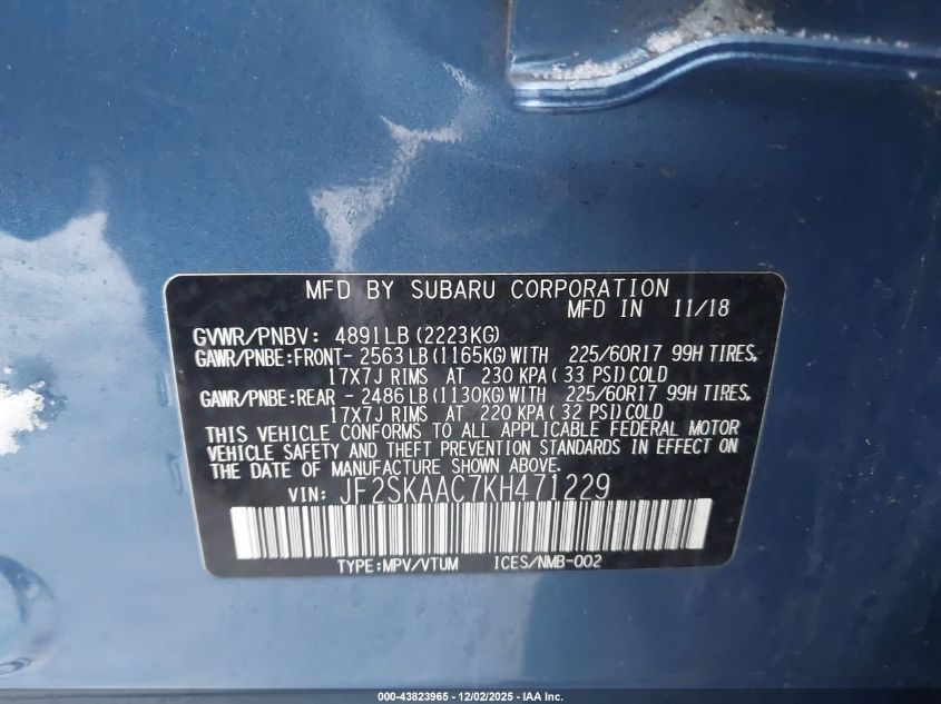 2019 SUBARU FORESTER 2019 року Бензин, 2.5, Полный привод, vin - JF2SKAAC7KH471229 из США