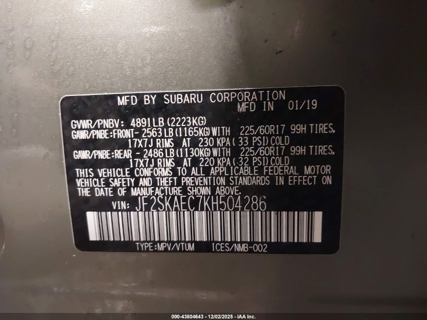 2019 SUBARU FORESTER 2019 року Бензин, 2.5, Полный привод, vin - JF2SKAEC7KH504286 из США