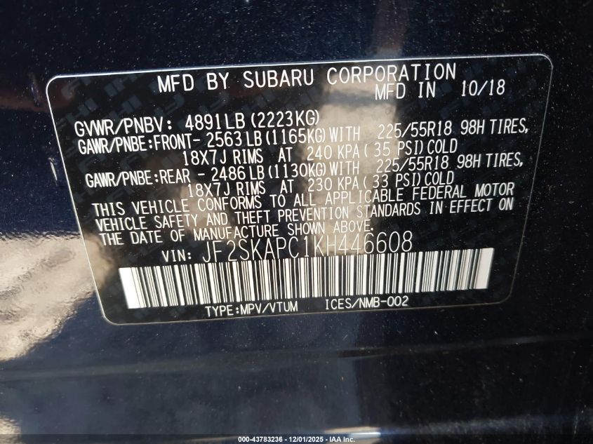 2019 SUBARU FORESTER 2019 року Бензин, 2.5, Полный привод, vin - JF2SKAPC1KH446608 из США