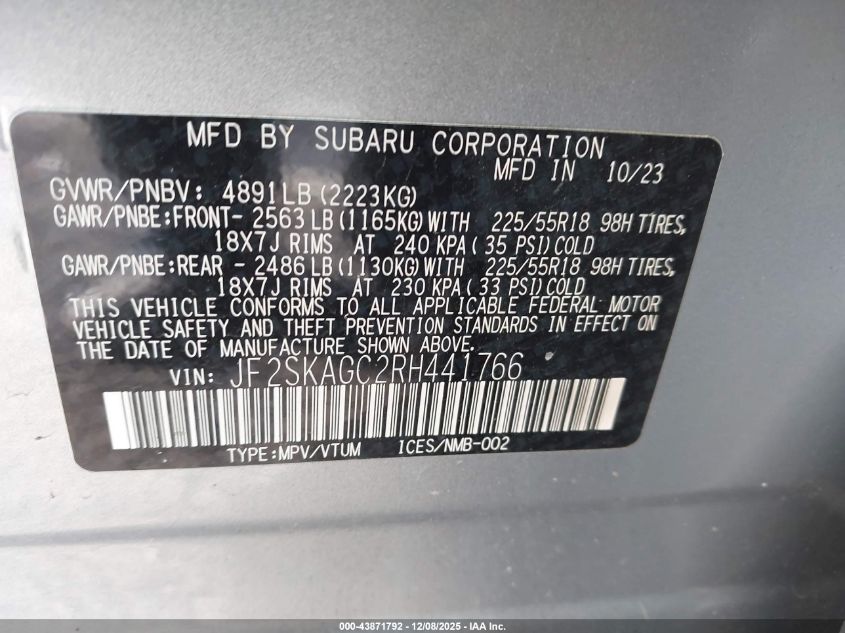 2024 SUBARU FORESTER 2024 року Бензин, 2.5, Полный привод, vin - JF2SKAGC2RH441766 из США