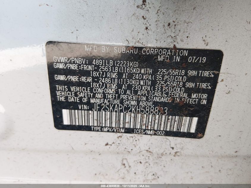 2019 SUBARU FORESTER 2019 року Бензин, 2.5, Полный привод, vin - JF2SKAPC2KH588823 из США