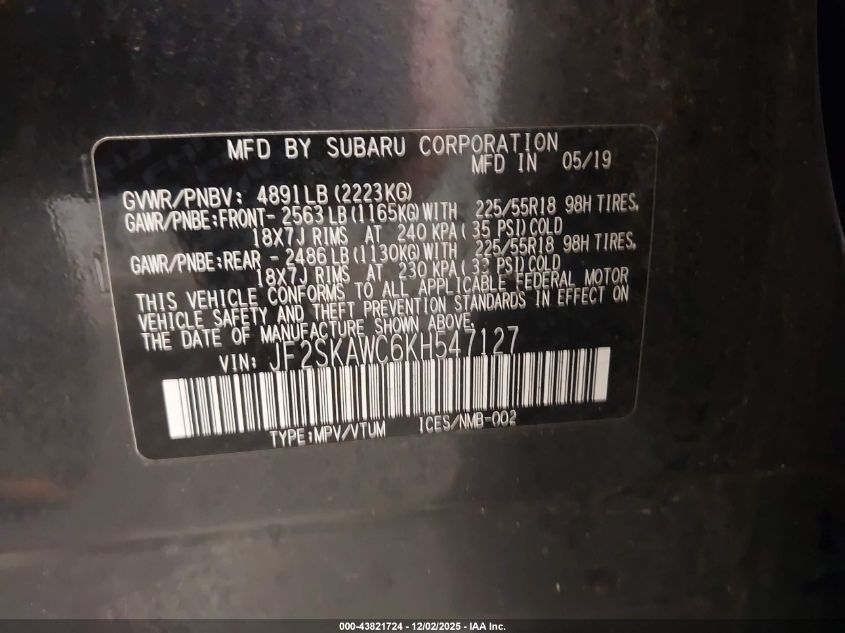 2019 SUBARU FORESTER 2019 року Бензин, 2.5, Полный привод, vin - JF2SKAWC6KH547127 из США