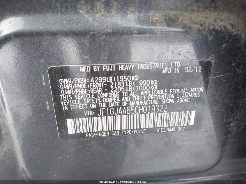 2012 SUBARU IMPREZA 2012 року Бензин, 2.0, Полный привод, vin - JF1GJAA65CH019322 из США