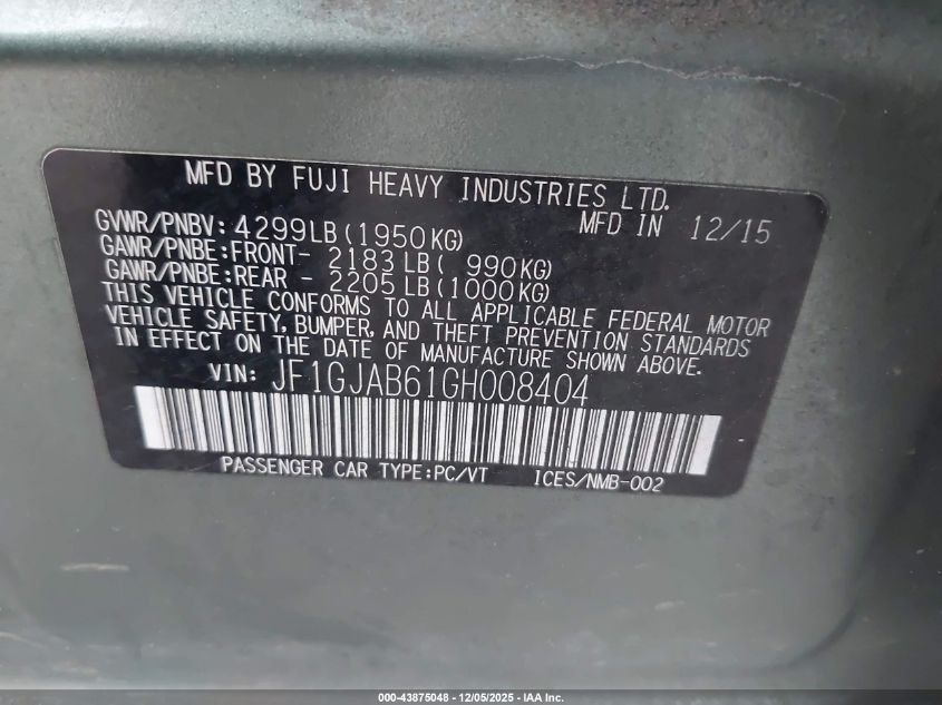 2016 SUBARU IMPREZA 2016 року Бензин, 2.0, Полный привод, vin - JF1GJAB61GH008404 из США