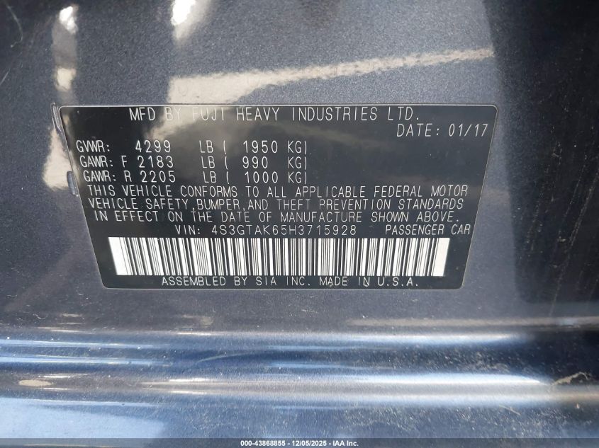 2017 SUBARU IMPREZA 2017 року Бензин, 2.0, Полный привод, vin - 4S3GTAK65H3715928 из США