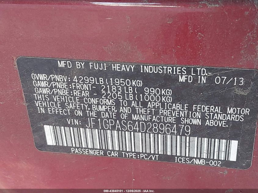 2013 SUBARU IMPREZA 2013 року Бензин, 2.0, Полный привод, vin - JF1GPAS64D2896479 из США