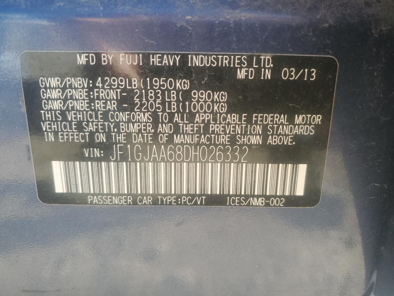 2013 SUBARU IMPREZA 2013 року Бензин, 2.0, Полный привод, vin - JF1GJAA68DH026332 из США