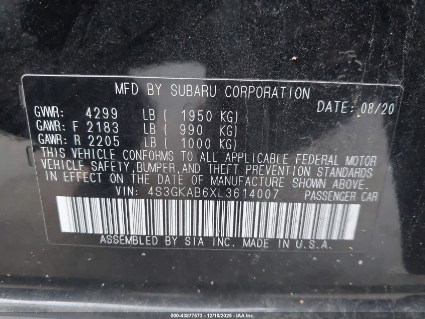 2020 SUBARU IMPREZA 2020 року Бензин, 2.0, Полный привод, vin - 4S3GKAB6XL3614007 из США