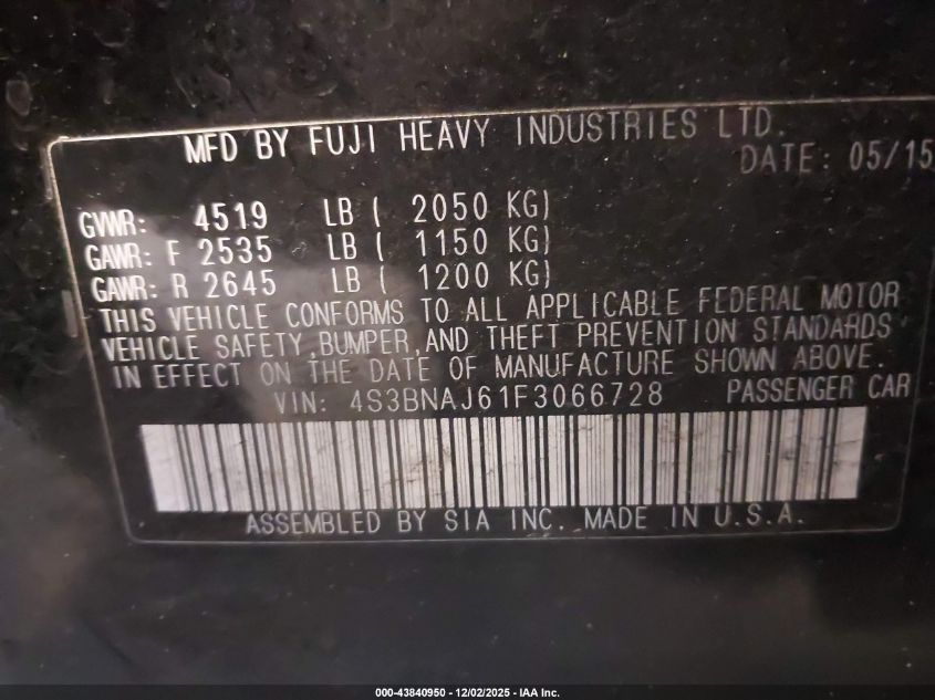 2015 SUBARU LEGACY 2015 року Бензин, 2.5, Полный привод, vin - 4S3BNAJ61F3066728 из США