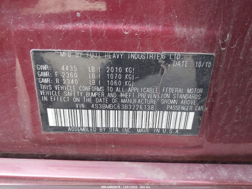 2011 SUBARU LEGACY 2011 року Бензин, 2.5, Полный привод, vin - 4S3BMBC63B3226138 из США