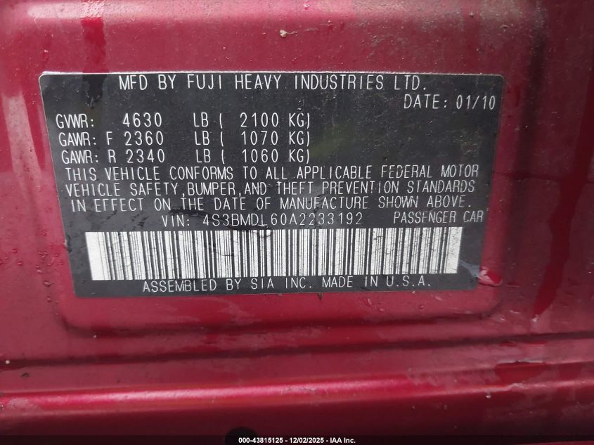 2010 SUBARU LEGACY 2010 року Бензин, 3.6, Полный привод, vin - 4S3BMDL60A2233192 из США
