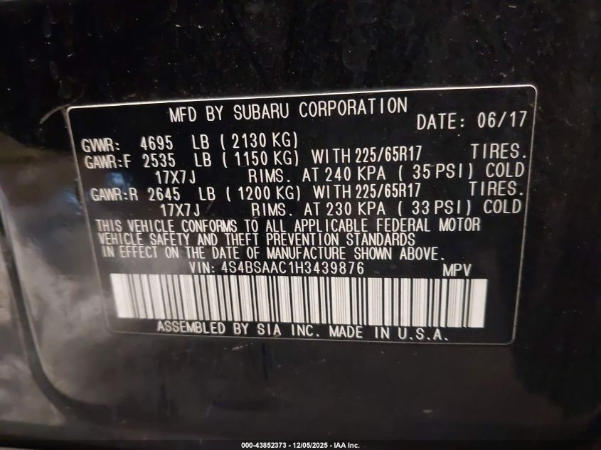 2017 SUBARU OUTBACK 2017 року Бензин, 2.5, Полный привод, vin - 4S4BSAAC1H3439876 из США