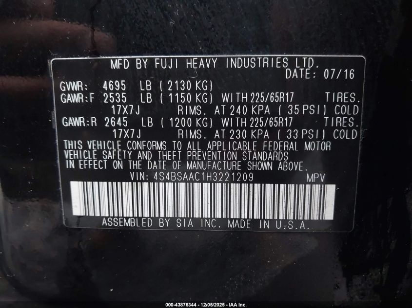 2017 SUBARU OUTBACK 2017 року Бензин, 2.5, Полный привод, vin - 4S4BSAAC1H3221209 из США