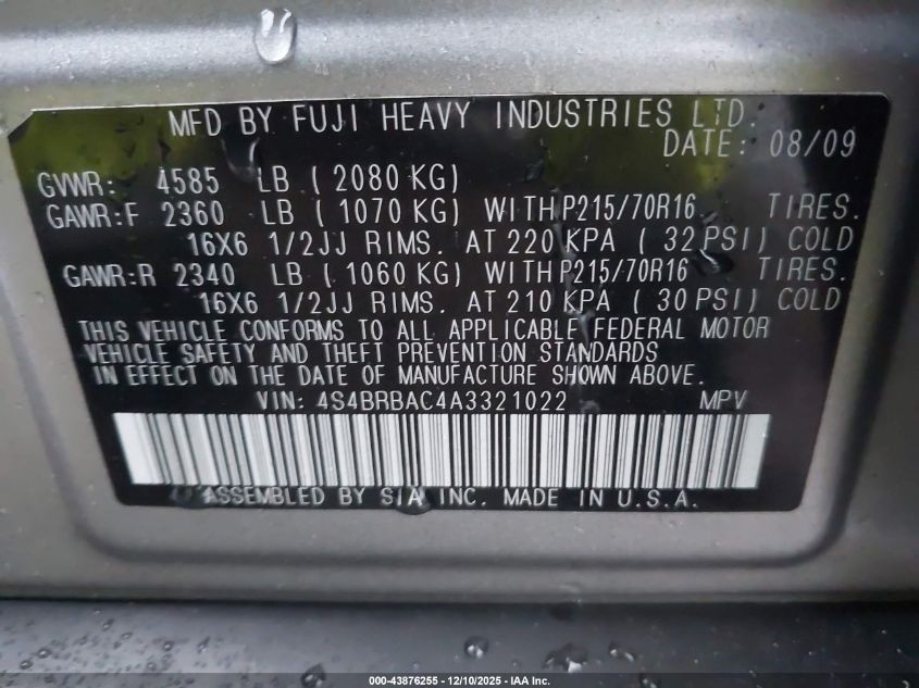 2010 SUBARU OUTBACK 2.5I PREMIUM
