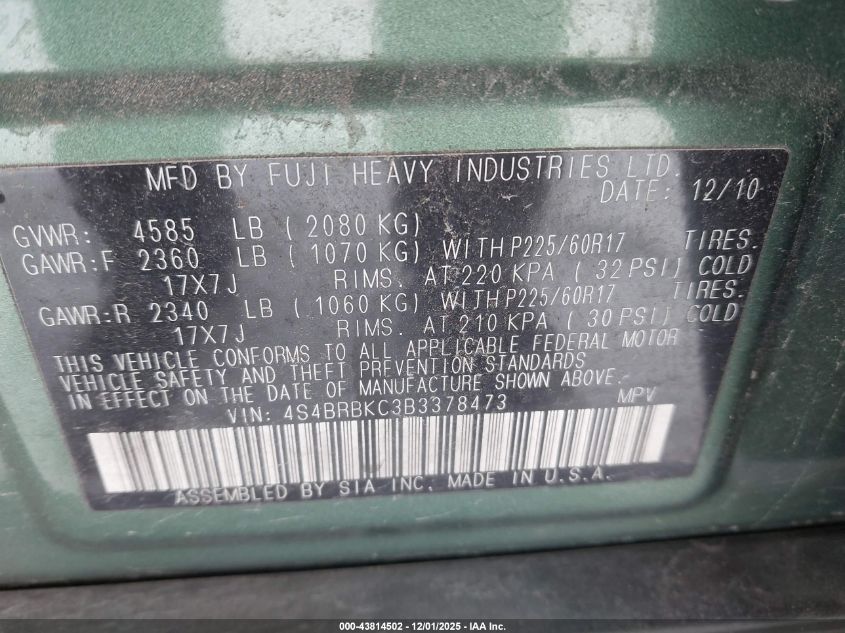 2011 SUBARU OUTBACK 2.5I LIMITED