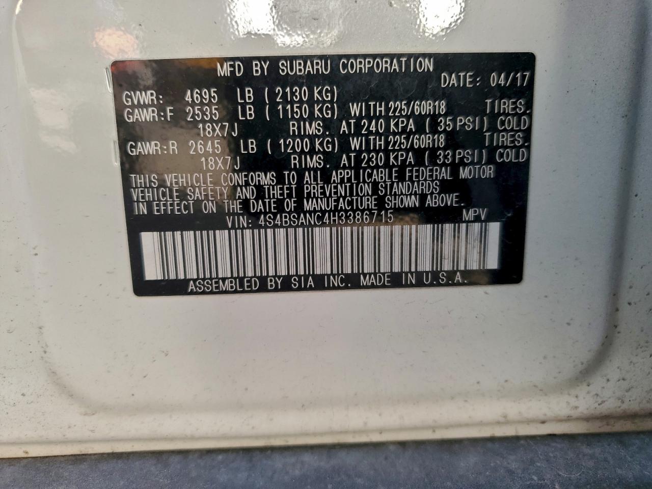 Цвет БелыйЦилиндры 4Привод Полный приводVIN 4S4BSANC4H3386715Состояние ЗаводитсяПовреждения Передняя или задняя AutoRIA