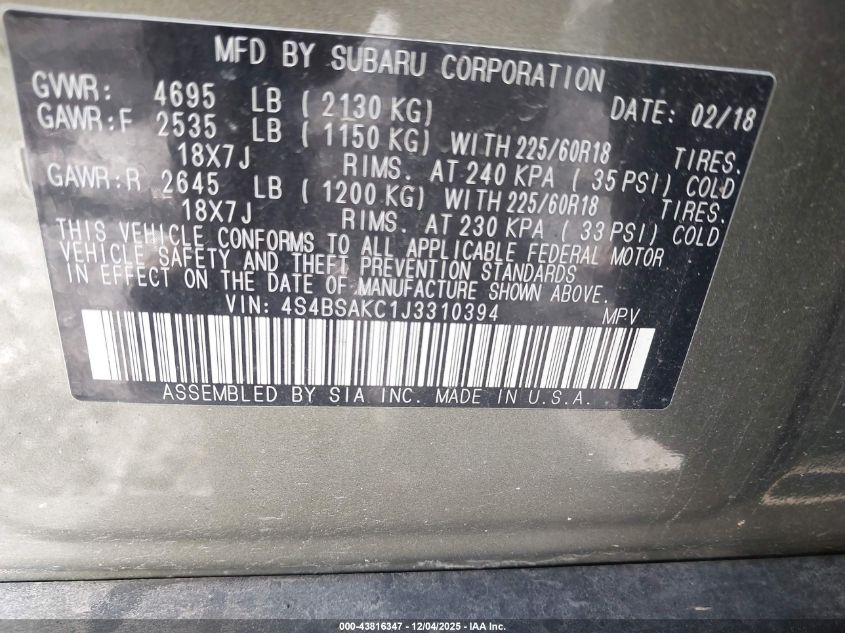2018 SUBARU OUTBACK 2.5I