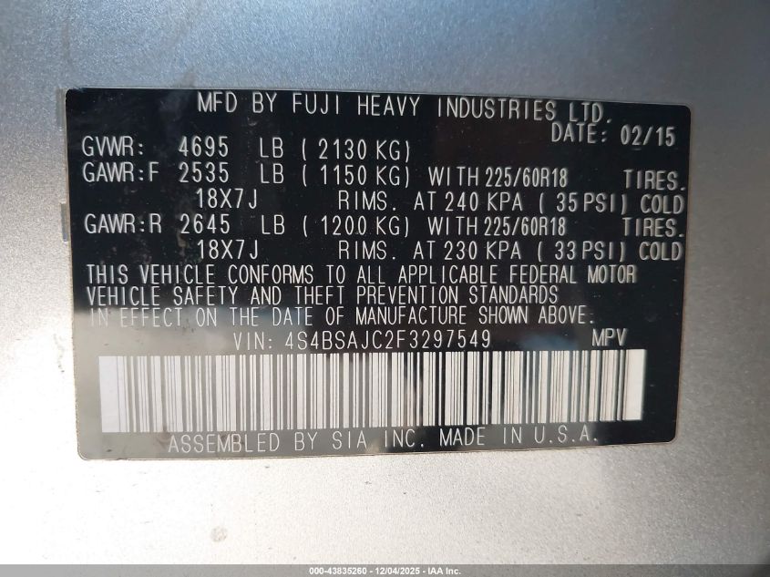 2015 SUBARU OUTBACK 2.5I LIMITED
