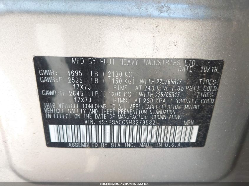 2017 SUBARU OUTBACK 2017 року Бензин, 2.5, Полный привод, vin - 4S4BSACC5H3279532 из США