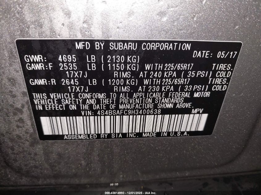 2017 SUBARU OUTBACK 2017 року Бензин, 2.5, Полный привод, vin - 4S4BSAFC9H3400638 из США