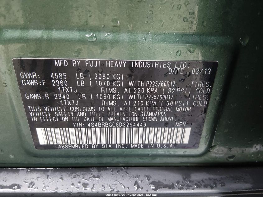 Цвет ЗеленыйЦилиндры 4Привод Полный приводVIN 4S4BRBGC8D3294449Состояние СтационарноПовреждения Передняя или задняя AutoRIA